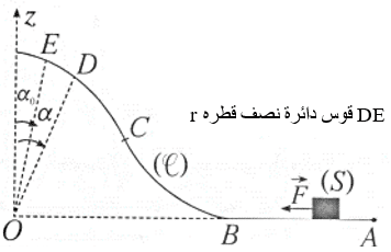 نعتبر الاحتكاكات مهملة ينطلق جسم صلب نعتبره نقطيا من النقطة A بدون سرعة إبتدائية تحت تأثير قوة F ثابتة تطبق عليه فقط بين A و B فيتحرك على المسار BE ليصل إلى النقطة E بسرعة منعدمة ( انظر الشكل)